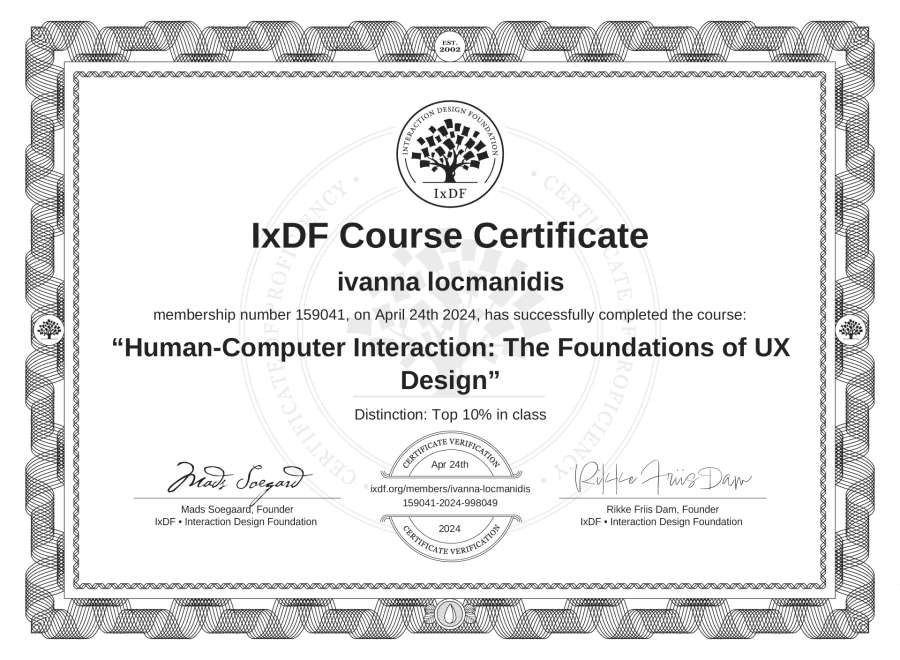 ivanna locmanidis's IxDF Course Certificate: Human-Computer Interaction: The Foundations of UX Design