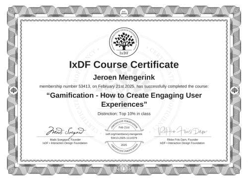 IxDF Course Certificates are awarded to Jeroen Mengerink in formal recognition of their coursework surpassing the rigorous benchmarks of exceptional performance established by the IxDF Educational Codex.