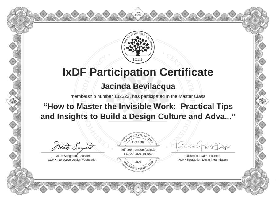 Jacinda Bevilacqua's IxDF Masterclass Certificate: How to Master the Invisible Work: Practical Tips and Insights to Build a Design Culture and Advance Your Career