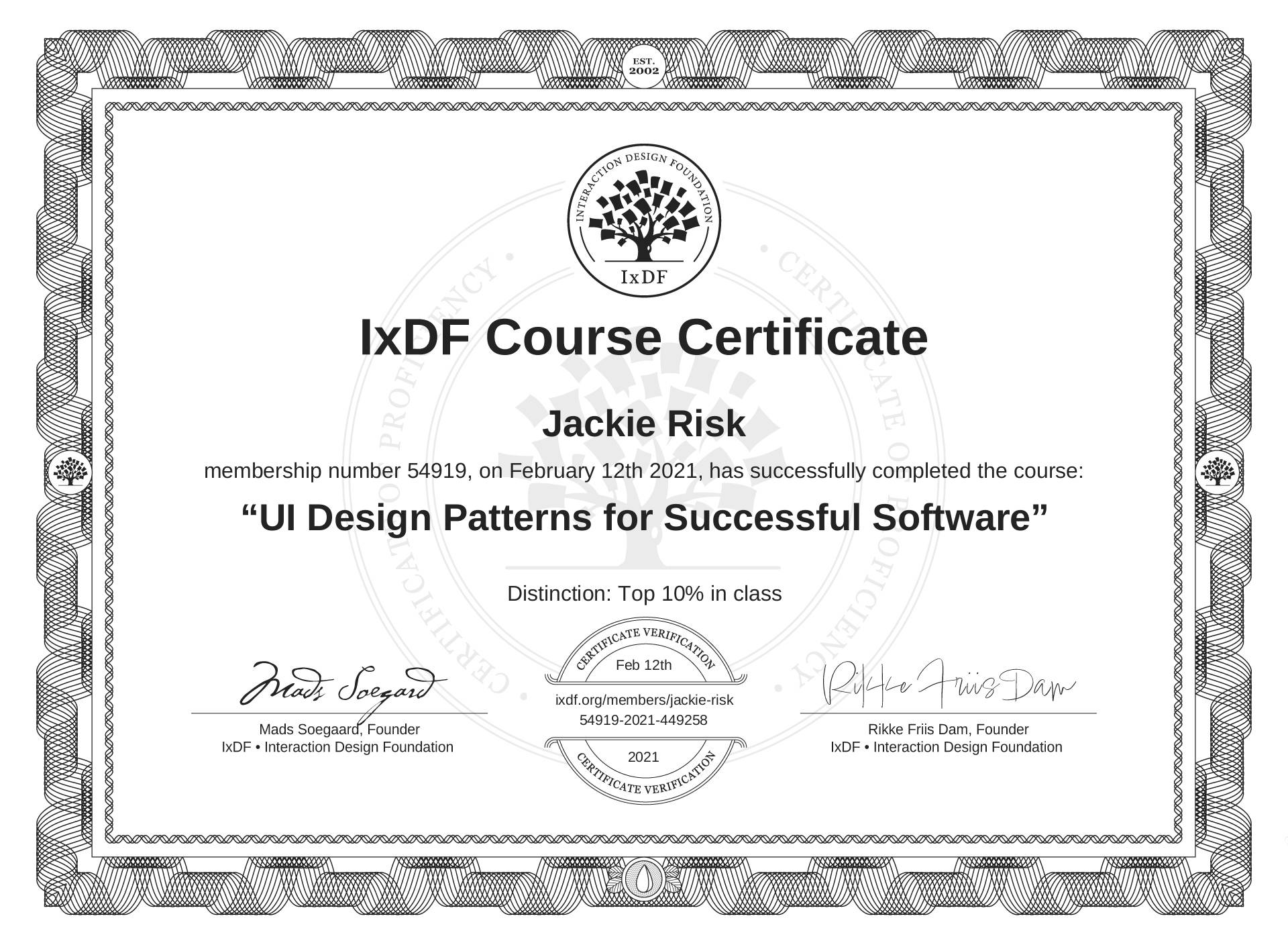 Jackie Risk's IxDF Course Certificate: UI Design Patterns for Successful Software