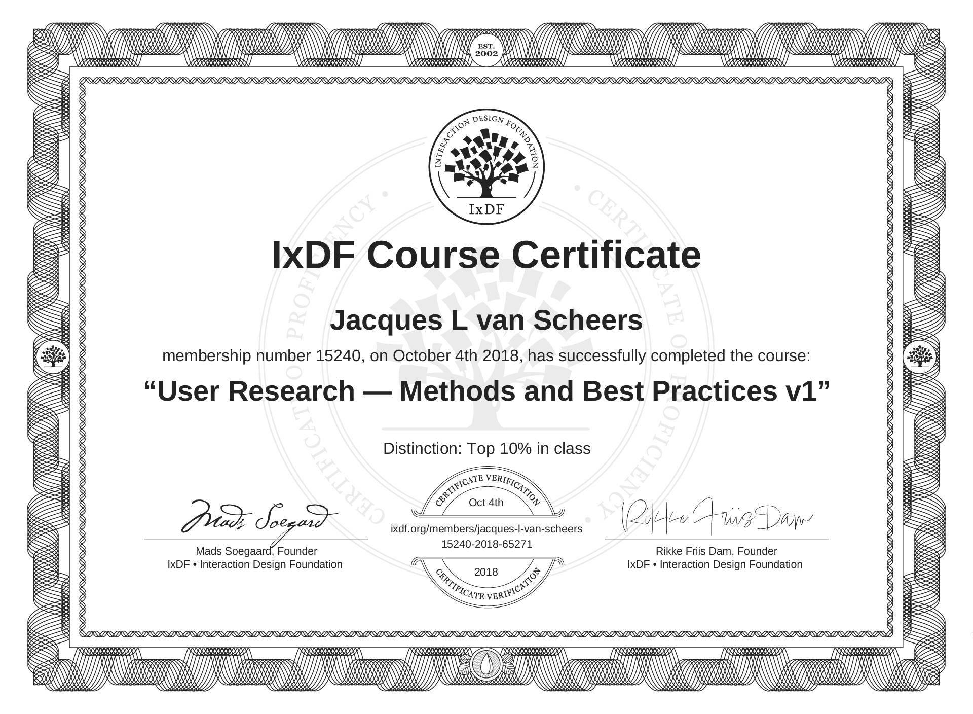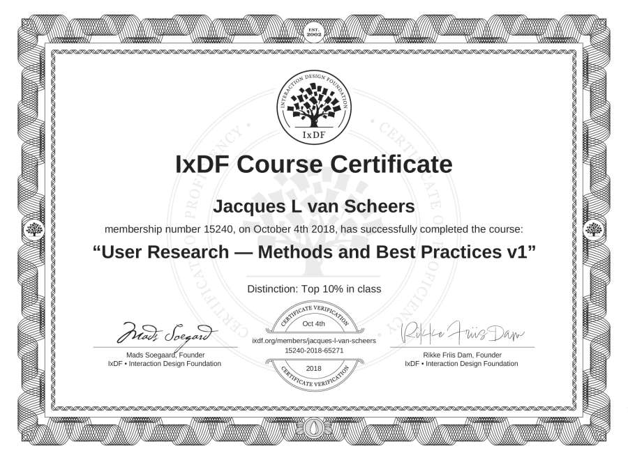 Jacques L van Scheers's IxDF Course Certificate: User Research — Methods and Best Practices v1