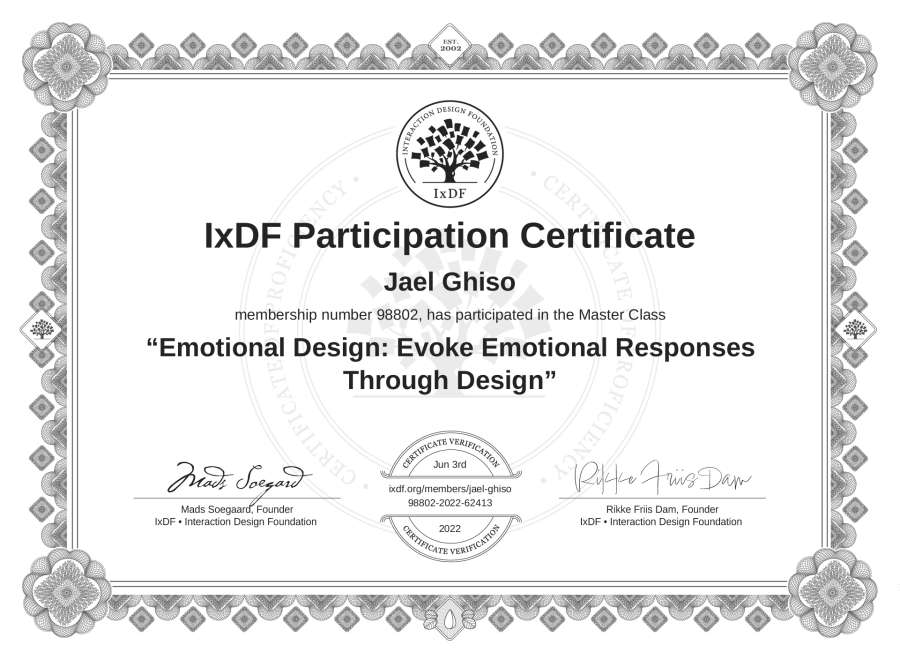 Jael Ghiso's IxDF Masterclass Certificate: Emotional Design: Evoke Emotional Responses Through Design