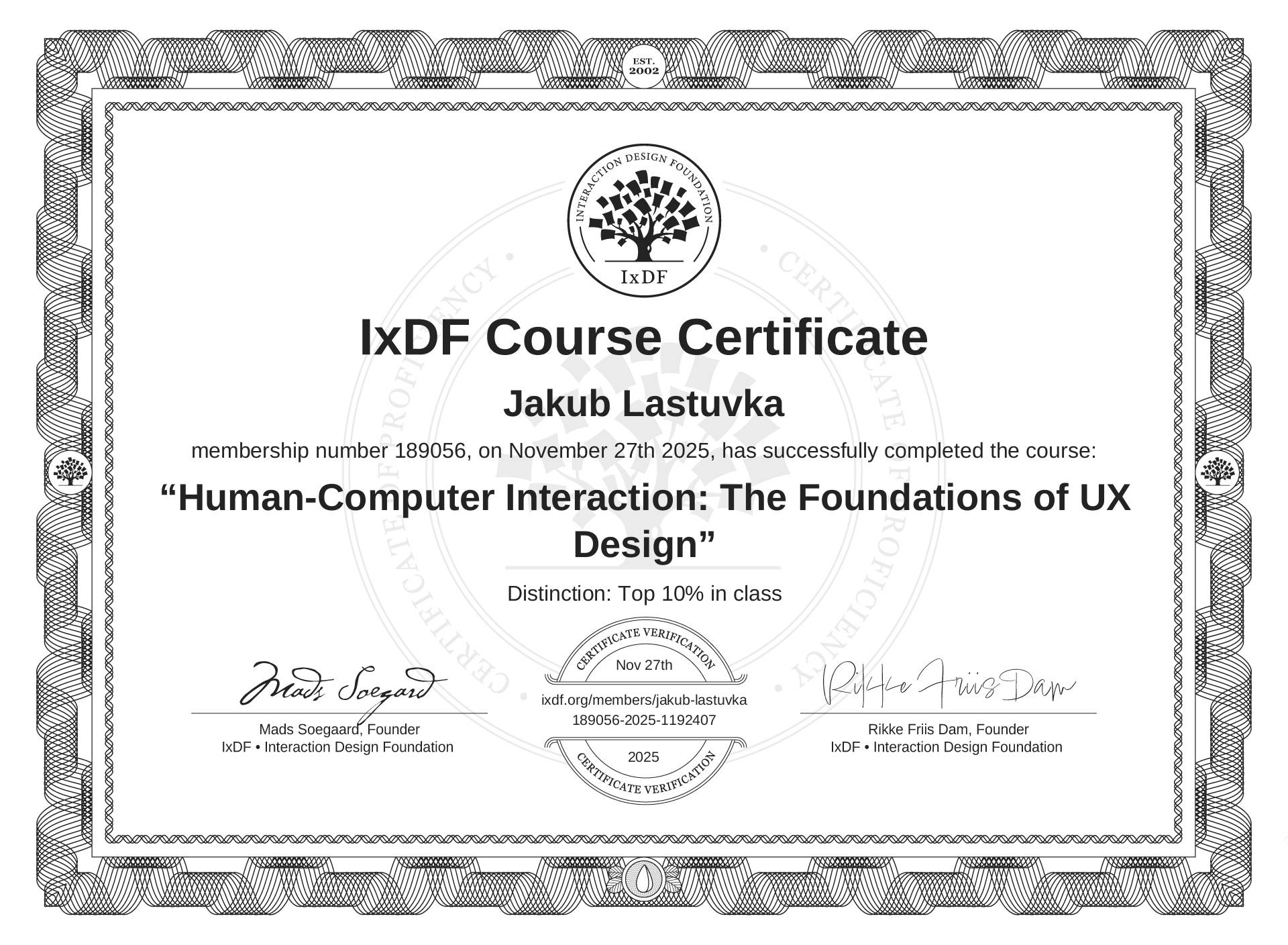 The IxDF Course Certificate above is awarded to Jakub Laštůvka with a Top 10% Distinction in formal recognition of their coursework surpassing the rigorous benchmarks of exceptional performance established by the IxDF Educational Codex.