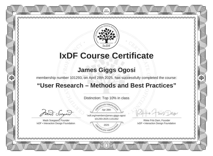 James Giggs Ogosi's IxDF Course Certificate: User Research – Methods and Best Practices