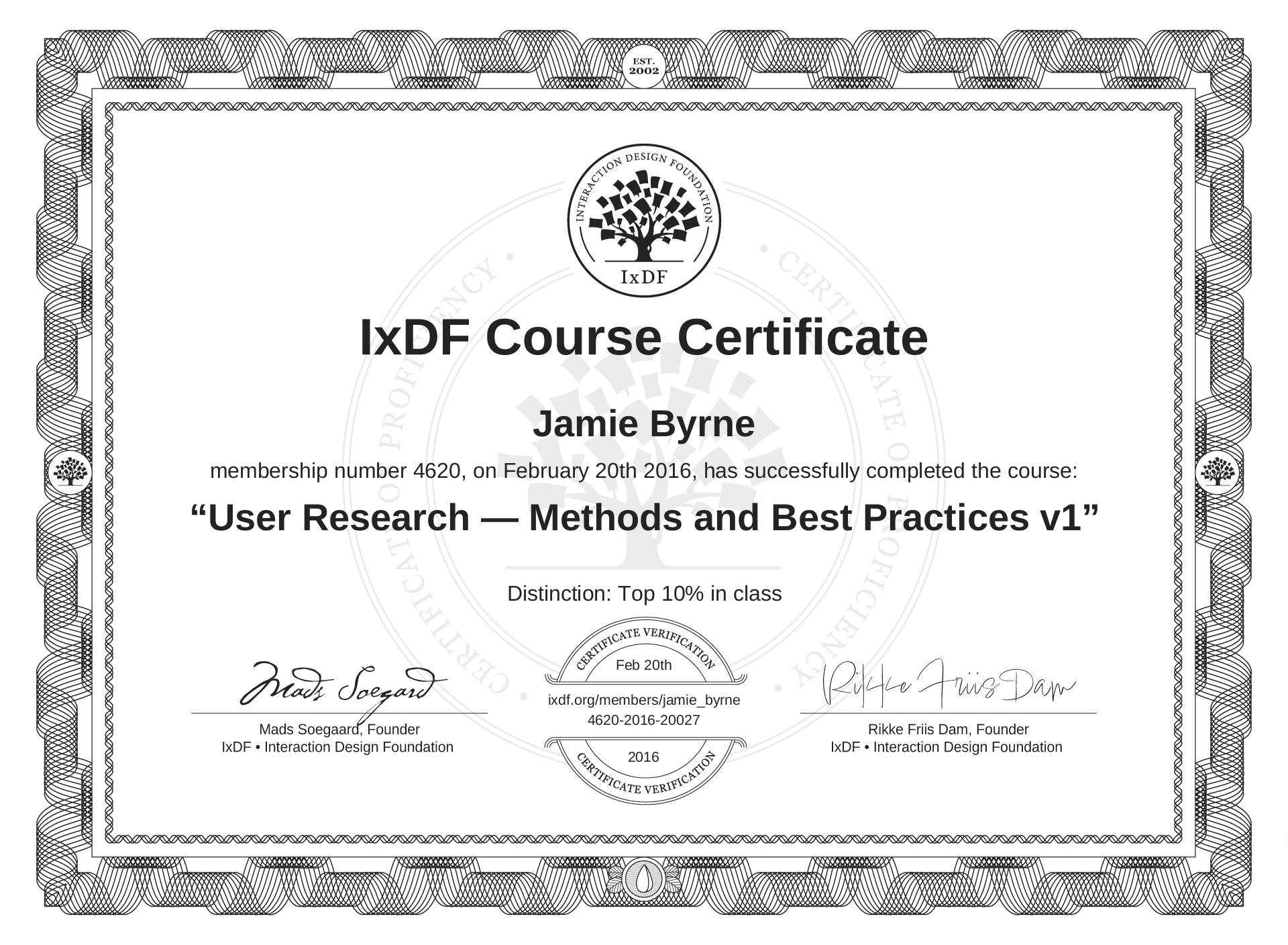 Jamie Byrne's IxDF Course Certificate: User Research — Methods and Best Practices v1