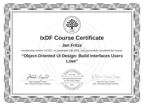 IxDF Course Certificates are awarded to Jan Fritze in formal recognition of their coursework surpassing the rigorous benchmarks of exceptional performance established by the IxDF Educational Codex.