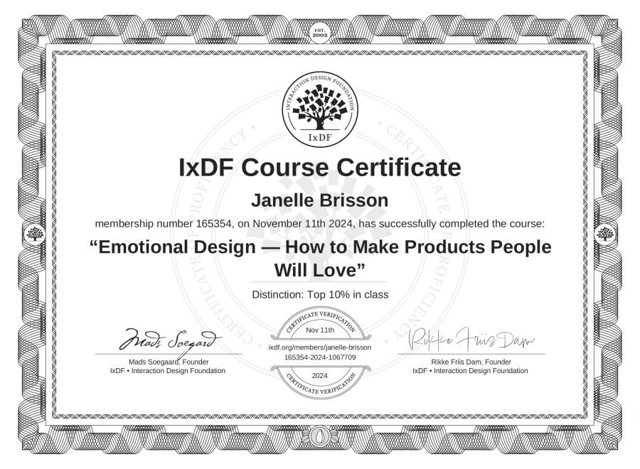 Janelle Brisson's IxDF Course Certificate: Emotional Design — How to Make Products People Will Love