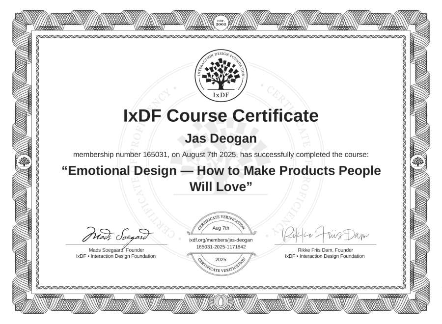 Jas Deogan's IxDF Course Certificate: Emotional Design — How to Make Products People Will Love