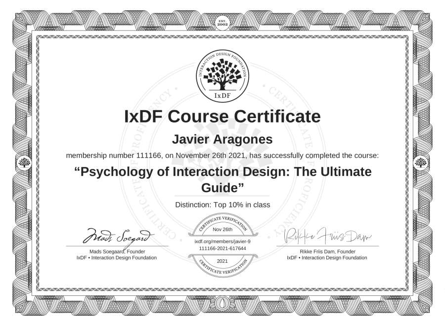 Javier Aragones's IxDF Course Certificate: Psychology of Interaction Design: The Ultimate Guide