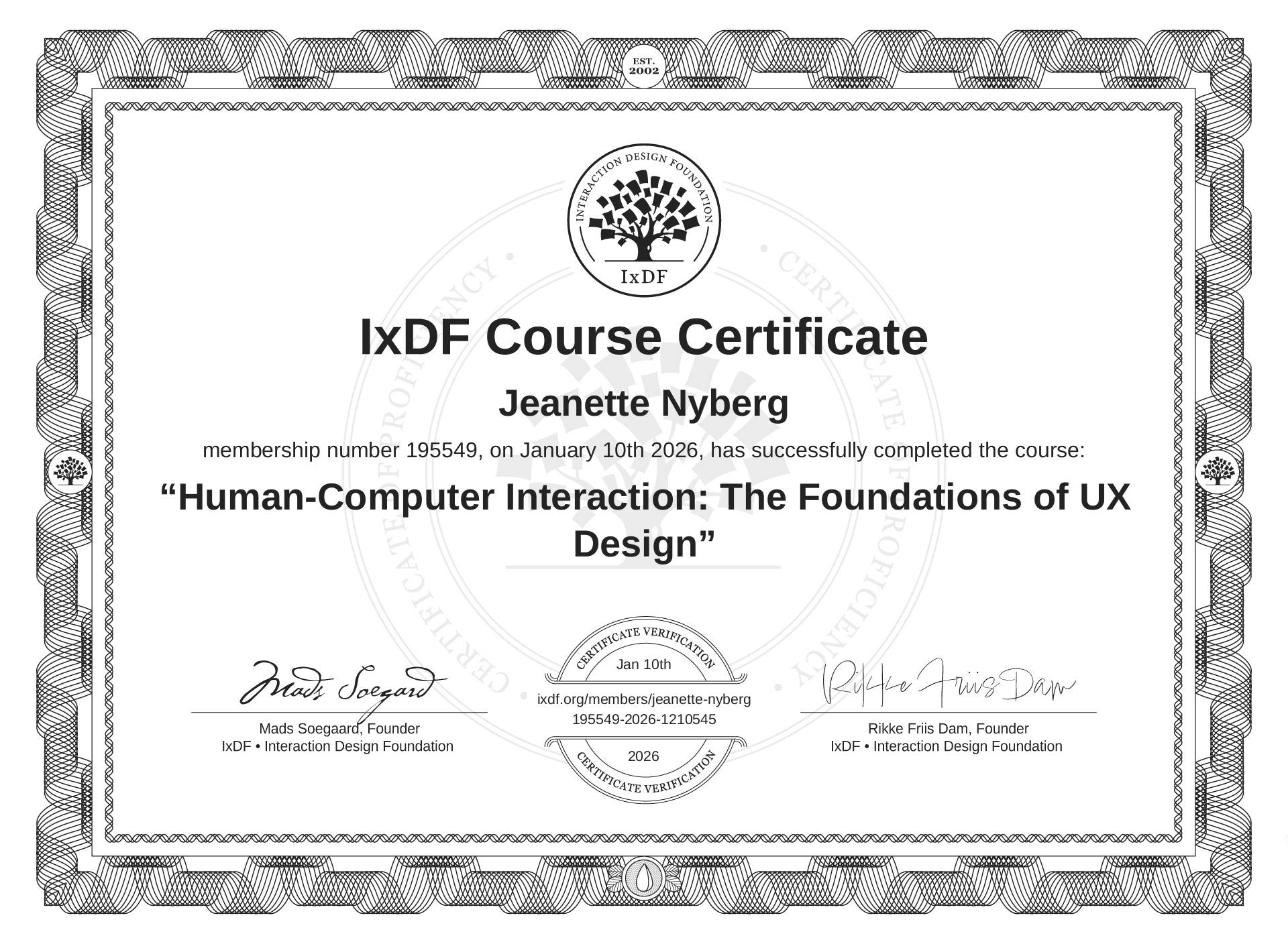 Jeanette Nyberg's IxDF Course Certificate: Human-Computer Interaction: The Foundations of UX Design