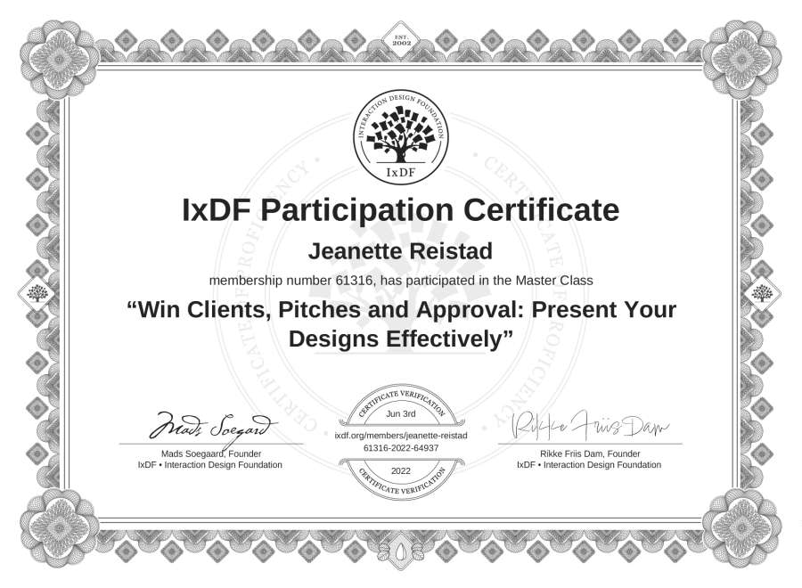 Jeanette Reistad's IxDF Masterclass Certificate: Win Clients, Pitches and Approval: Present Your Designs Effectively
