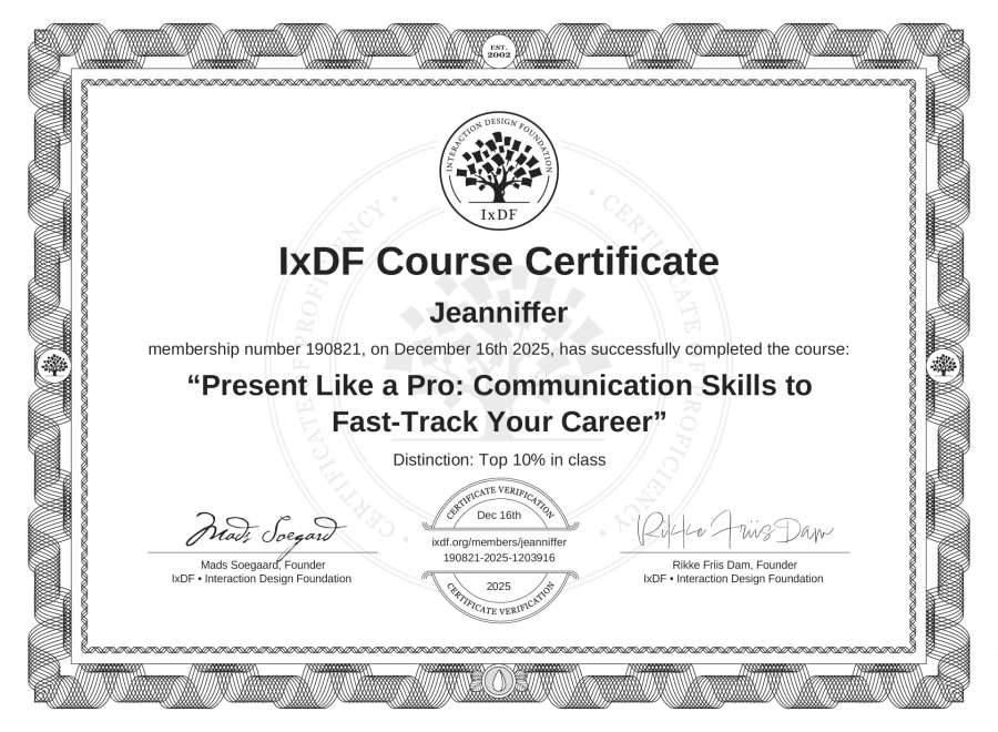 The IxDF Course Certificate above is awarded to Jeanniffer with a Top 10% Distinction in formal recognition of their coursework surpassing the rigorous benchmarks of exceptional performance established by the IxDF Educational Codex.