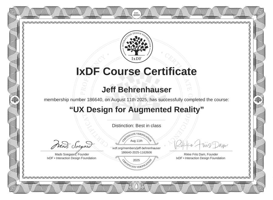 Jeff Behrenhauser's IxDF Course Certificate: UX Design for Augmented Reality