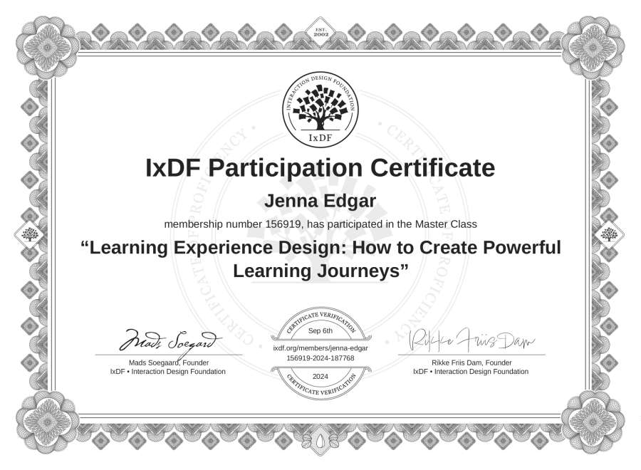 Jenna Edgar's IxDF Masterclass Certificate: Learning Experience Design: How to Create Powerful Learning Journeys