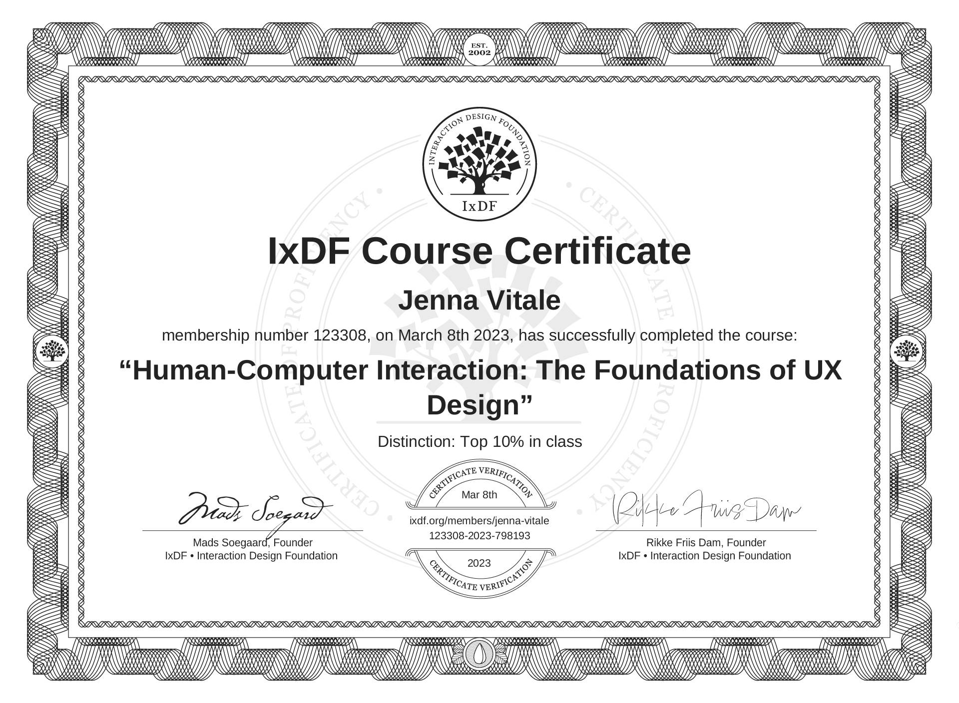 Jenna Vitale's IxDF Course Certificate: Human-Computer Interaction: The Foundations of UX Design