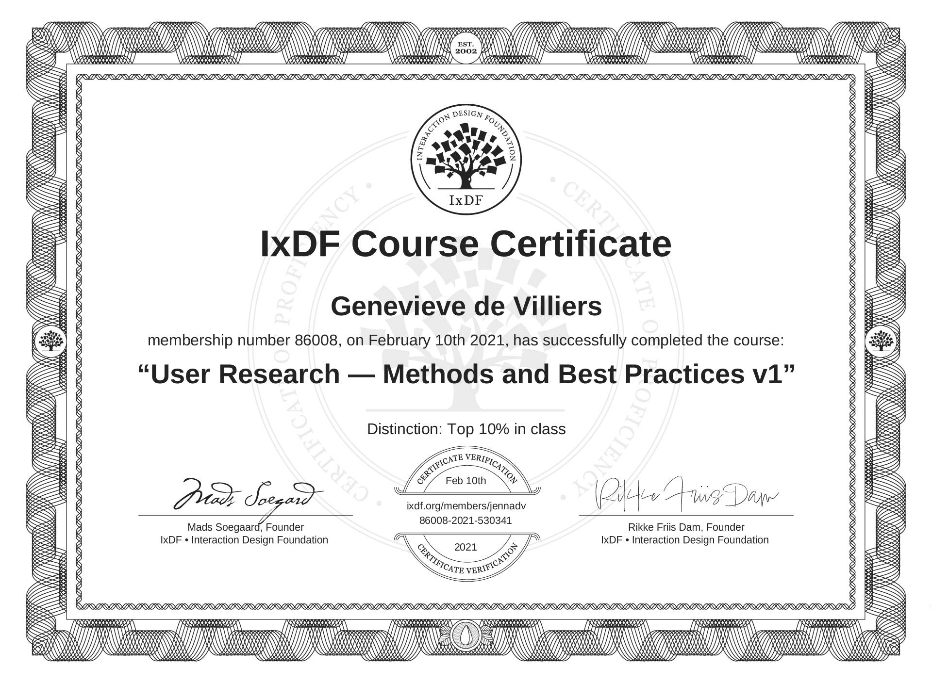 The IxDF Course Certificate above is awarded to Genevieve de Villiers with a Top 10% Distinction in formal recognition of their coursework surpassing the rigorous benchmarks of exceptional performance established by the IxDF Educational Codex.