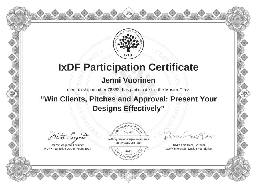 Jenni Vuorinen's IxDF Masterclass Certificate: Win Clients, Pitches and Approval: Present Your Designs Effectively