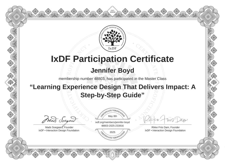 Jennifer Boyd's IxDF Masterclass Certificate: Learning Experience Design That Delivers Impact: A Step-by-Step Guide