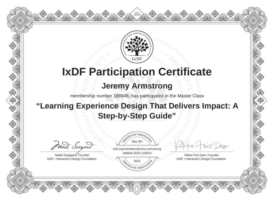 Jeremy Armstrong's IxDF Masterclass Certificate: Learning Experience Design That Delivers Impact: A Step-by-Step Guide