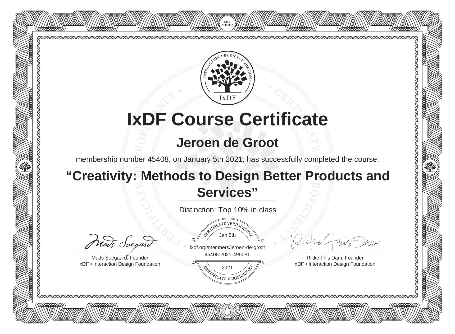 The IxDF Course Certificate above is awarded to Jeroen de Groot with a Top 10% Distinction in formal recognition of their coursework surpassing the rigorous benchmarks of exceptional performance established by the IxDF Educational Codex.