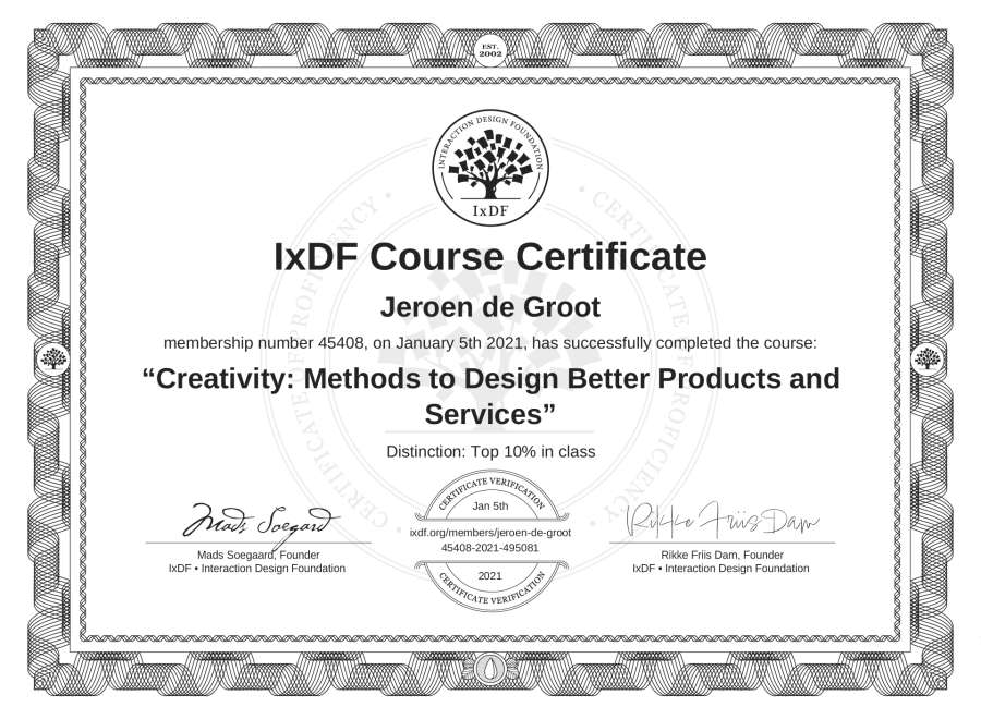 Jeroen de Groot's IxDF Course Certificate: Creativity: Methods to Design Better Products and Services
