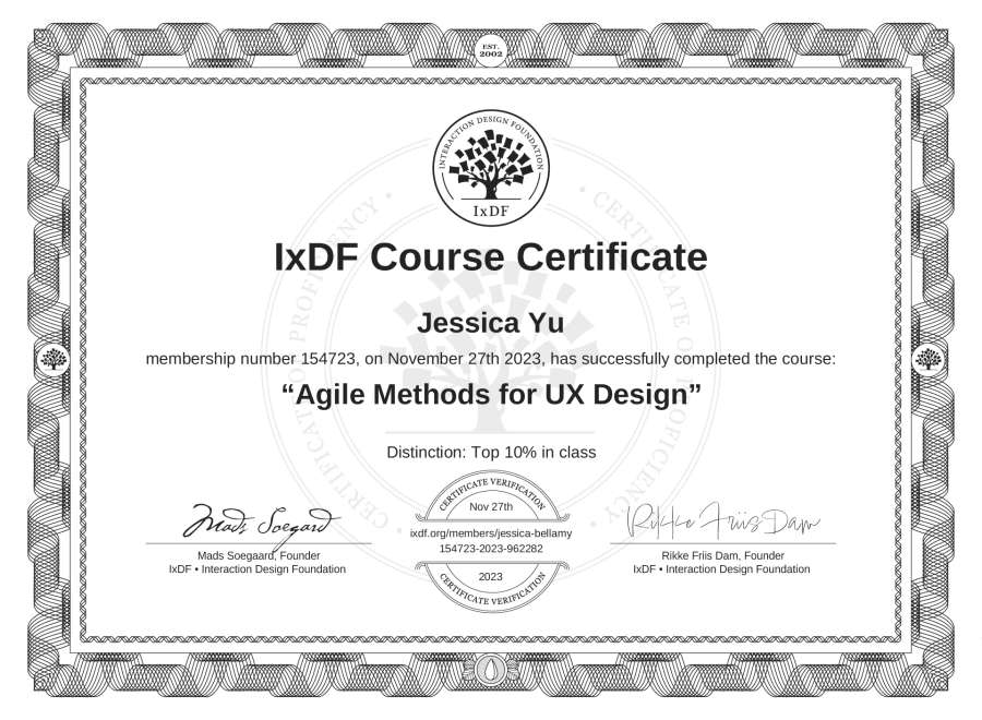 Jessica Yu's IxDF Course Certificate: Agile Methods for UX Design