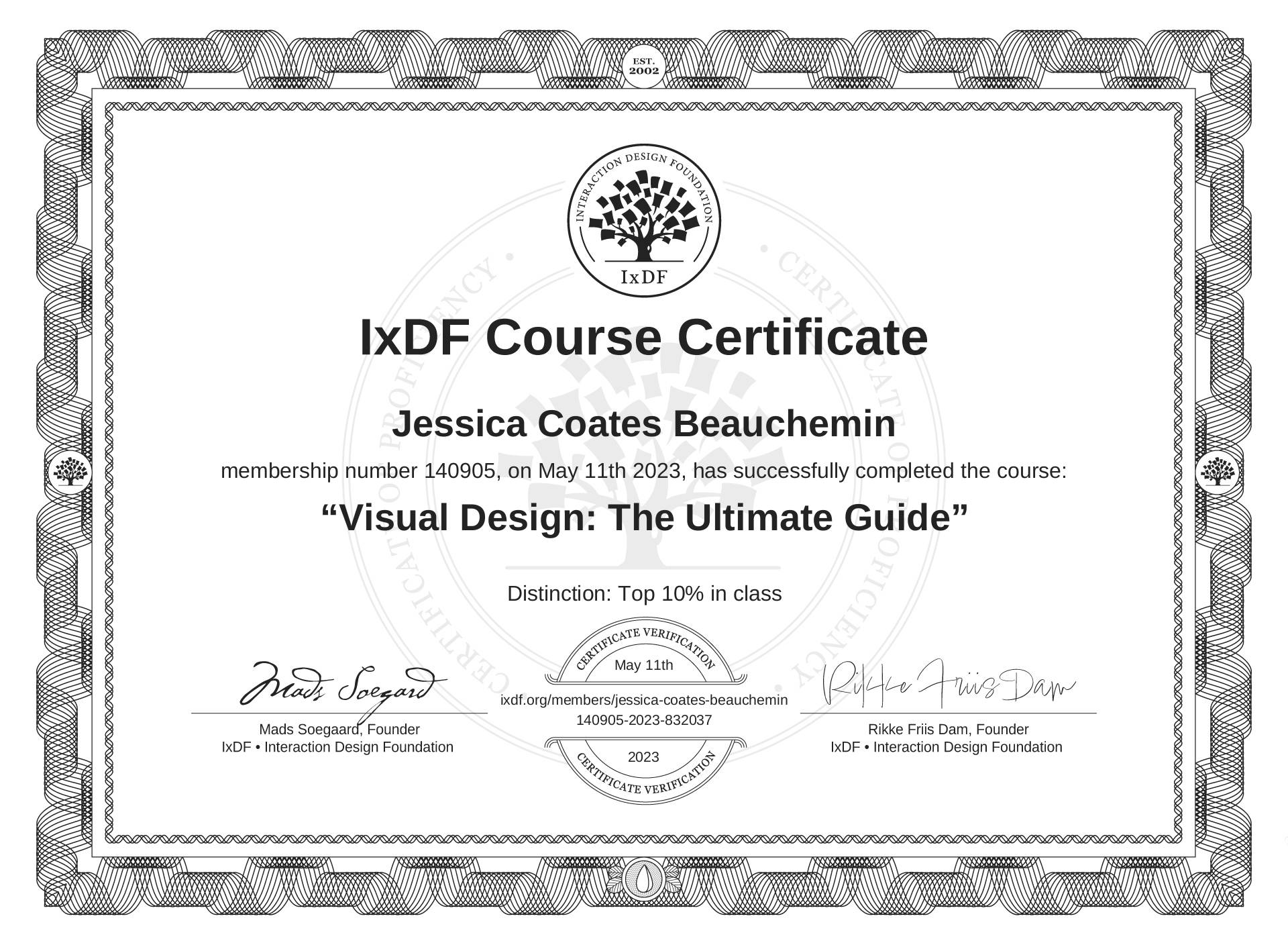 The IxDF Course Certificate above is awarded to Jessica Coates Beauchemin with a Top 10% Distinction in formal recognition of their coursework surpassing the rigorous benchmarks of exceptional performance established by the IxDF Educational Codex.