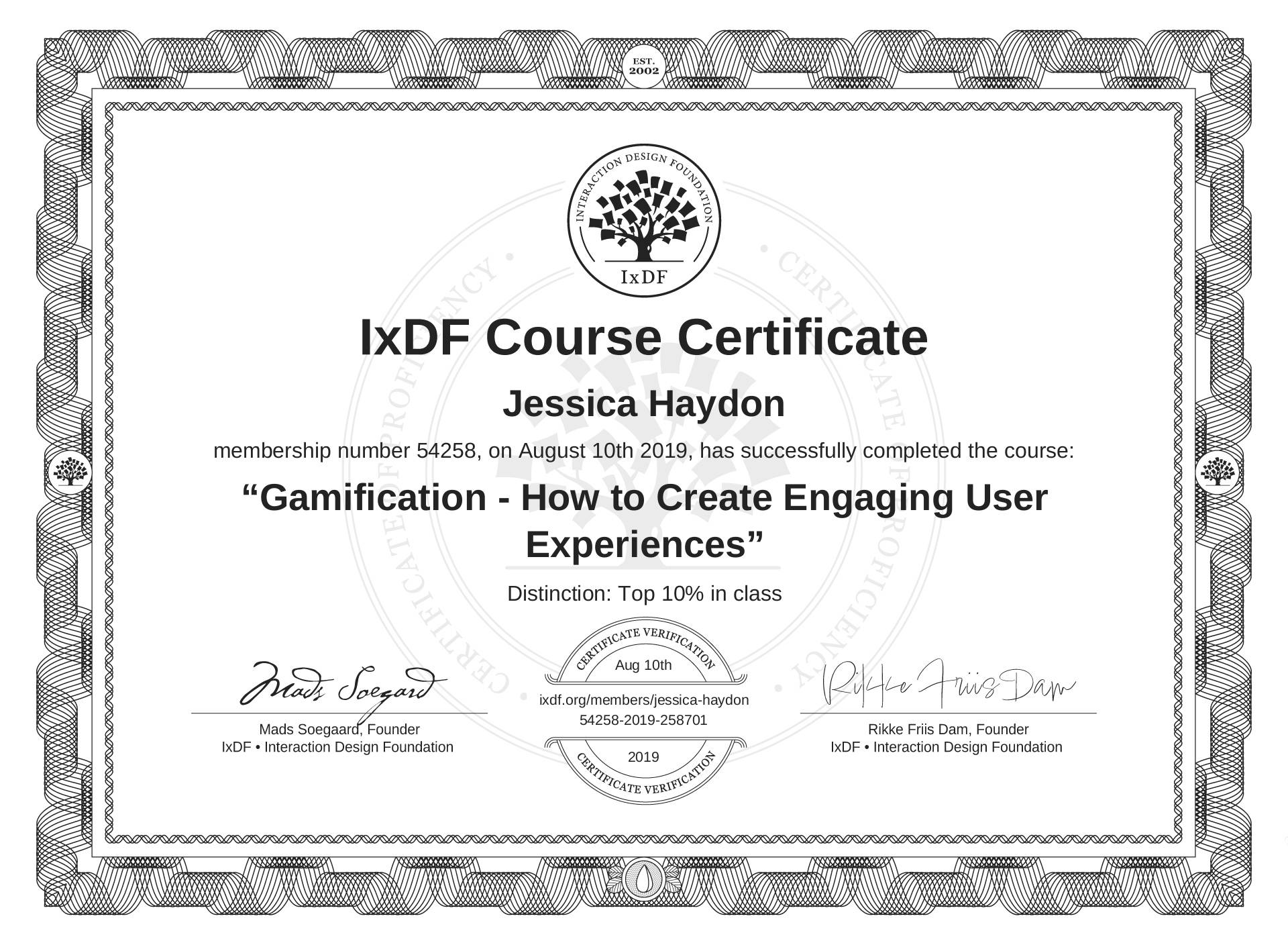 Jessica Haydon's IxDF Course Certificate: Gamification - How to Create Engaging User Experiences