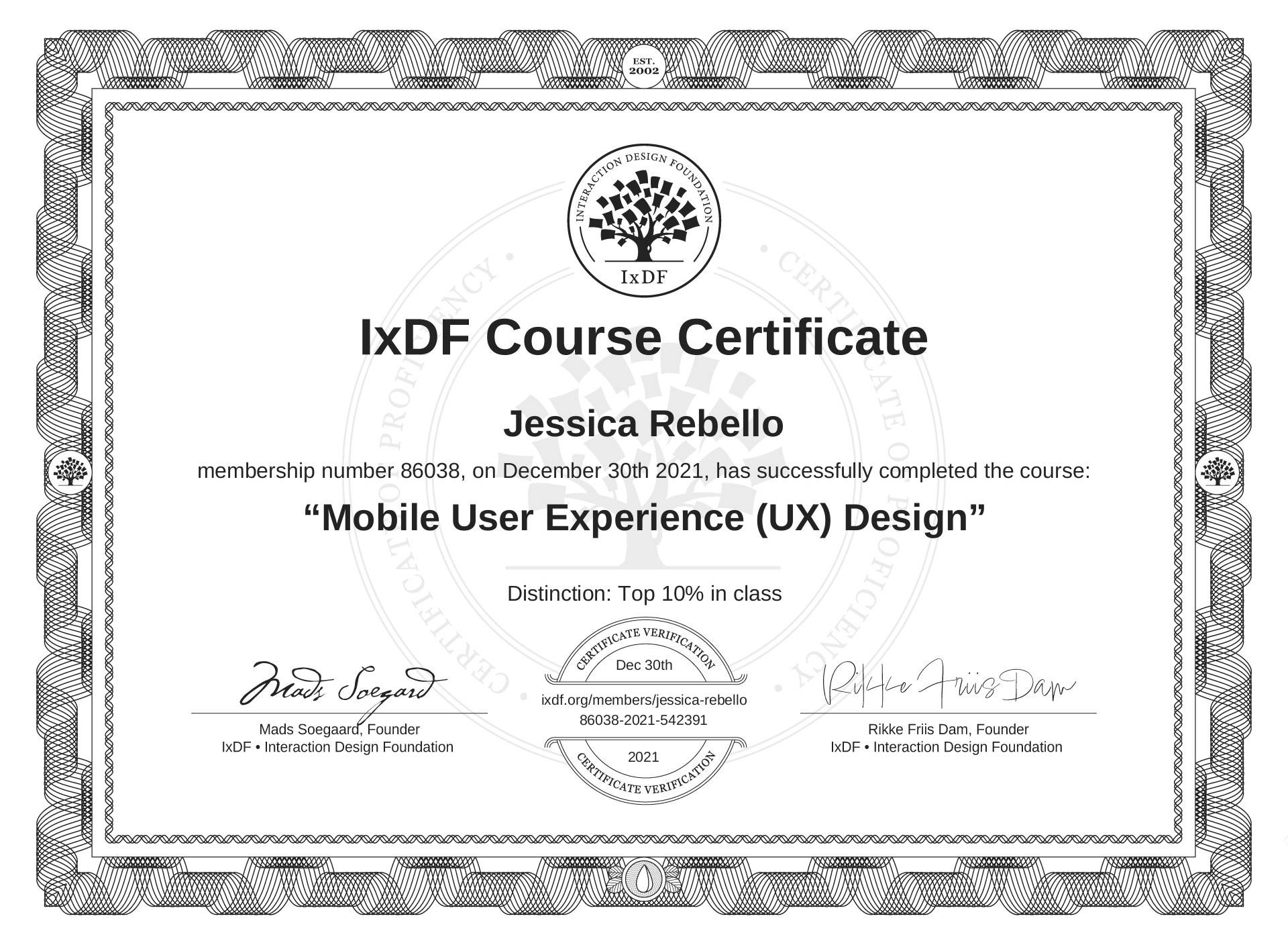 The IxDF Course Certificate above is awarded to Jessica Rebello with a Top 10% Distinction in formal recognition of their coursework surpassing the rigorous benchmarks of exceptional performance established by the IxDF Educational Codex.