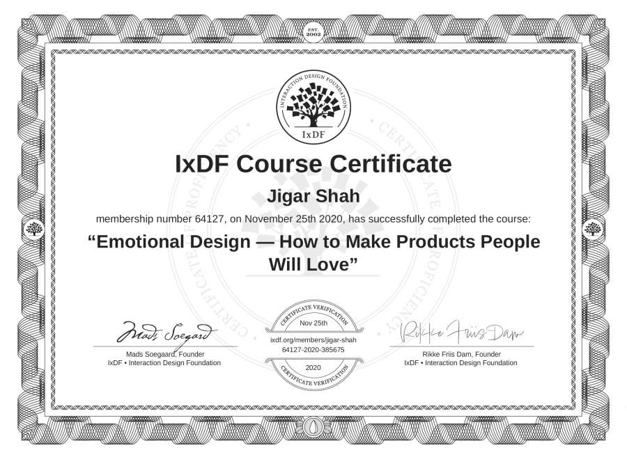 Jigar Shah's IxDF Course Certificate: Emotional Design — How to Make Products People Will Love
