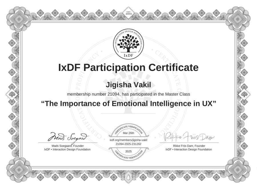 Jigisha Vakil's IxDF Masterclass Certificate: The Importance of Emotional Intelligence in UX