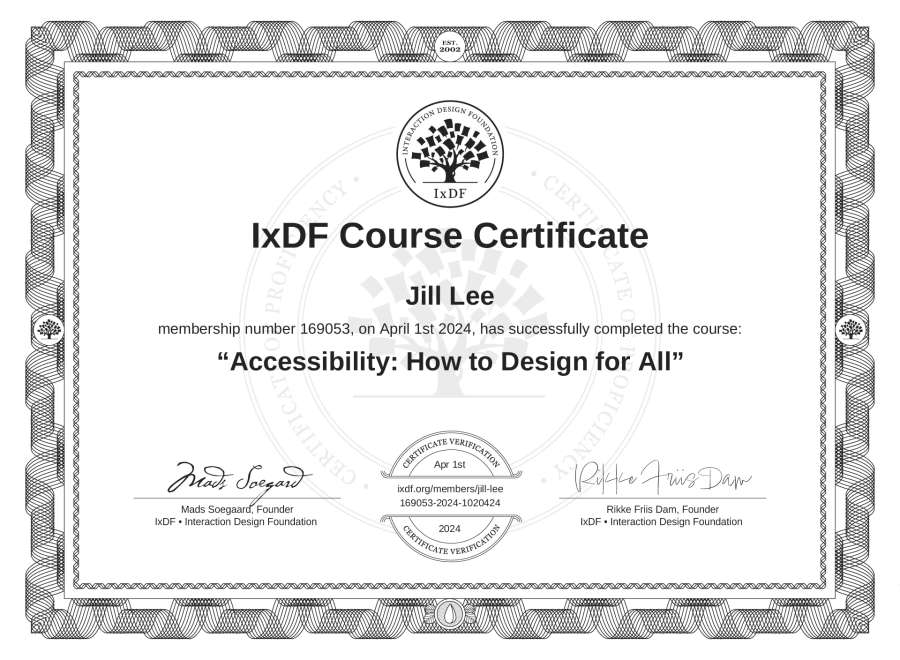 Jill Lee's IxDF Course Certificate: Accessibility: How to Design for All