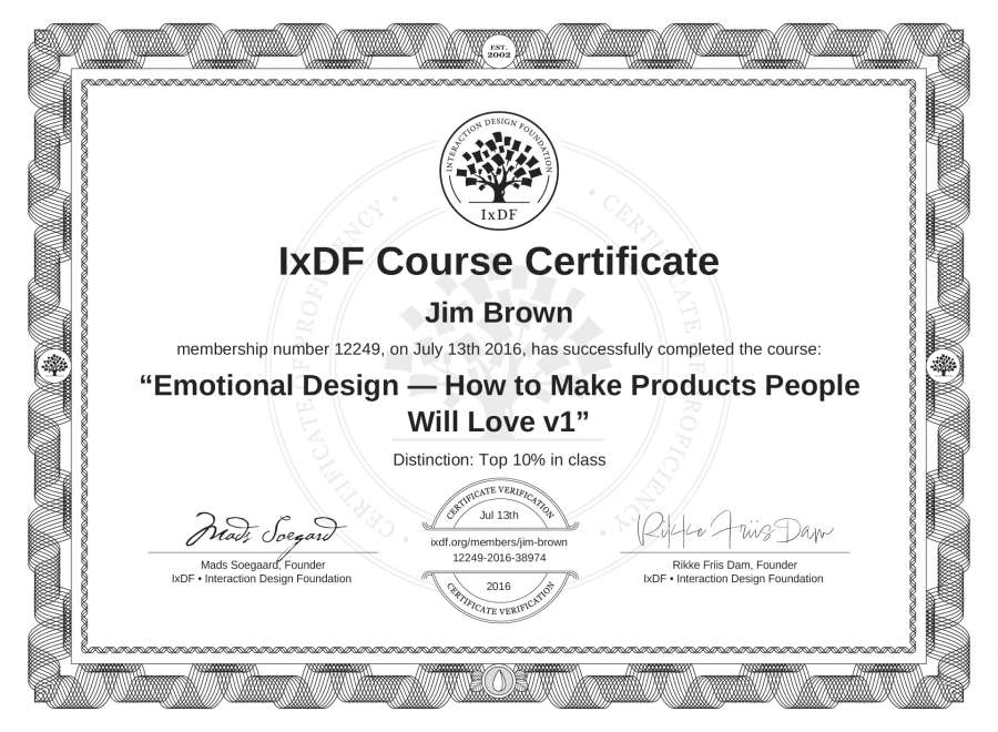 Jim Brown's IxDF Course Certificate: Emotional Design — How to Make Products People Will Love v1