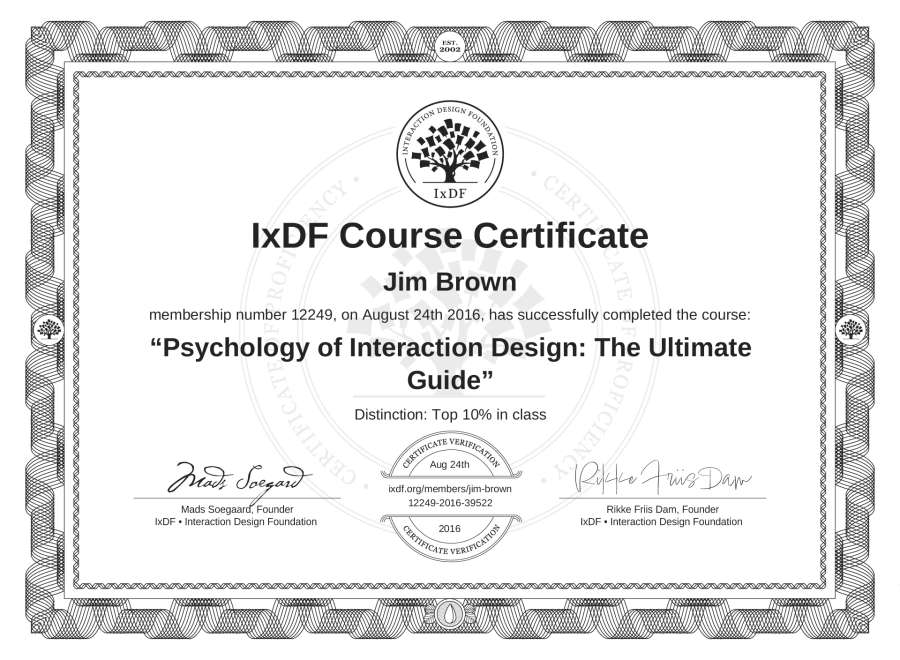 Jim Brown's IxDF Course Certificate: Psychology of Interaction Design: The Ultimate Guide