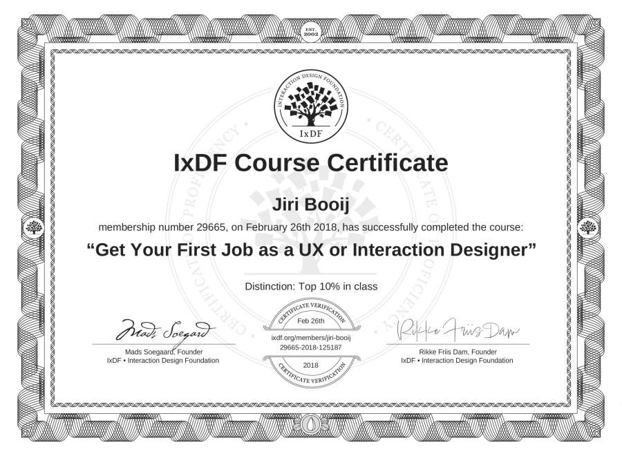 The IxDF Course Certificate above is awarded to Jiri Booij with a Top 10% Distinction in formal recognition of their coursework surpassing the rigorous benchmarks of exceptional performance established by the IxDF Educational Codex.