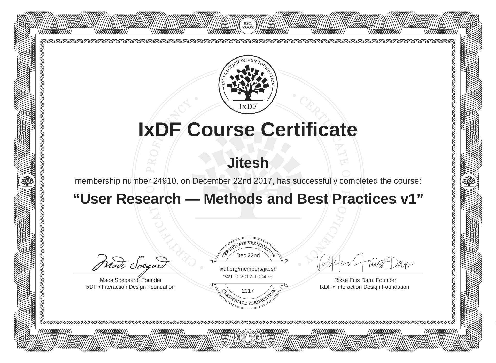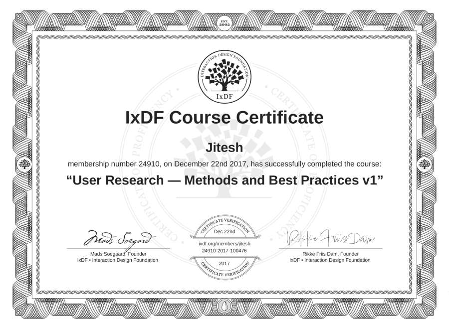 The IxDF Course Certificate above is awarded to Jitesh in formal recognition of their coursework surpassing the rigorous benchmarks of exceptional performance established by the IxDF Educational Codex.