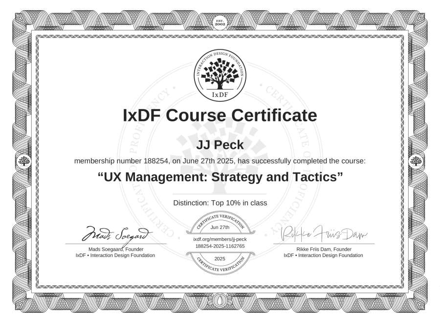The IxDF Course Certificate above is awarded to JJ Peck with a Top 10% Distinction in formal recognition of their coursework surpassing the rigorous benchmarks of exceptional performance established by the IxDF Educational Codex.