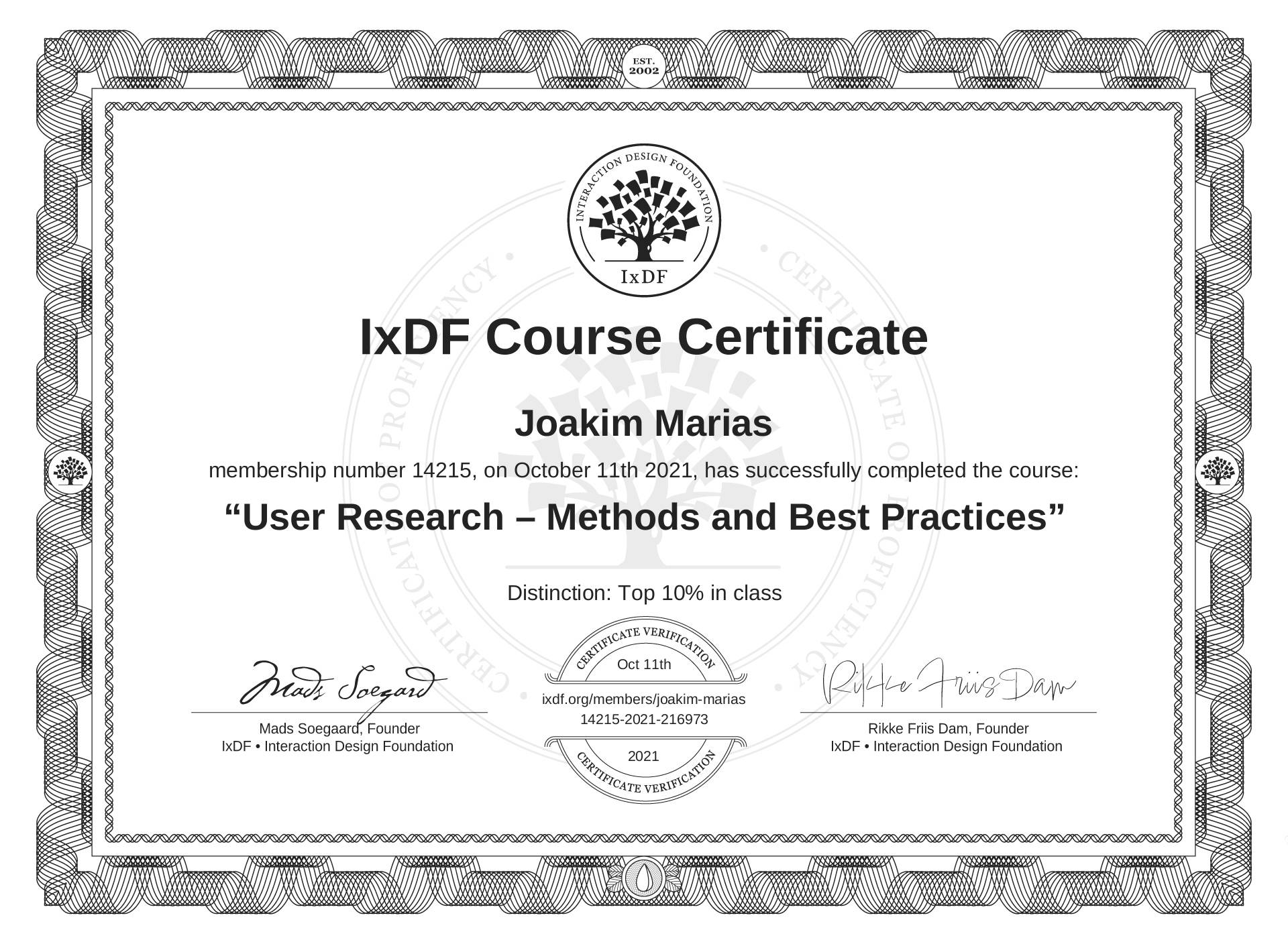The IxDF Course Certificate above is awarded to Joakim Marias with a Top 10% Distinction in formal recognition of their coursework surpassing the rigorous benchmarks of exceptional performance established by the IxDF Educational Codex.