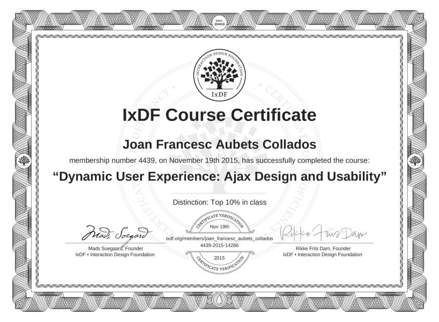 Joan Francesc Aubets Collados's IxDF Course Certificate: Dynamic User Experience: Ajax Design and Usability