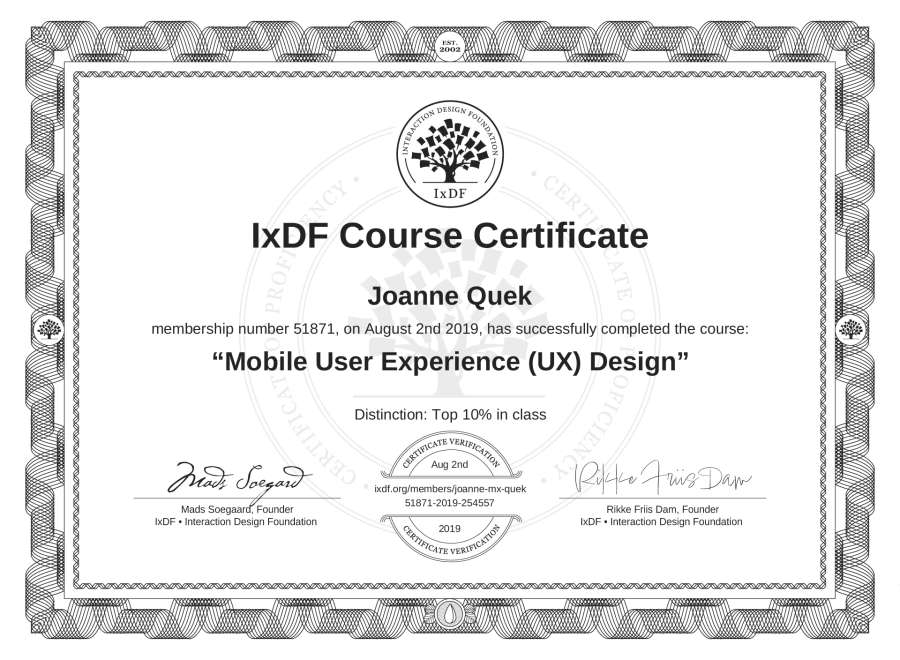 The IxDF Course Certificate above is awarded to Joanne Quek with a Top 10% Distinction in formal recognition of their coursework surpassing the rigorous benchmarks of exceptional performance established by the IxDF Educational Codex.