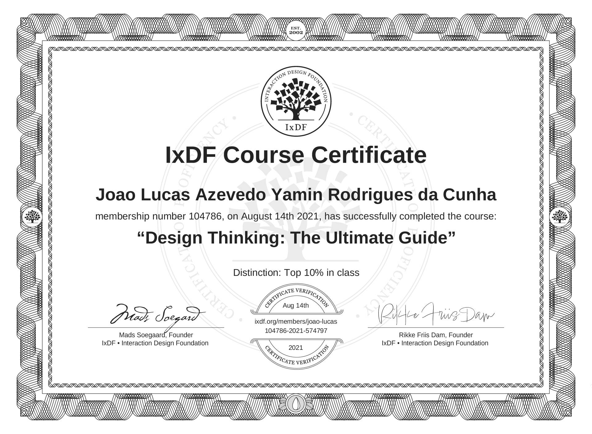 The IxDF Course Certificate above is awarded to João Lucas Azevedo Yamin Rodrigues da Cunha with a Top 10% Distinction in formal recognition of their coursework surpassing the rigorous benchmarks of exceptional performance established by the IxDF Educational Codex.