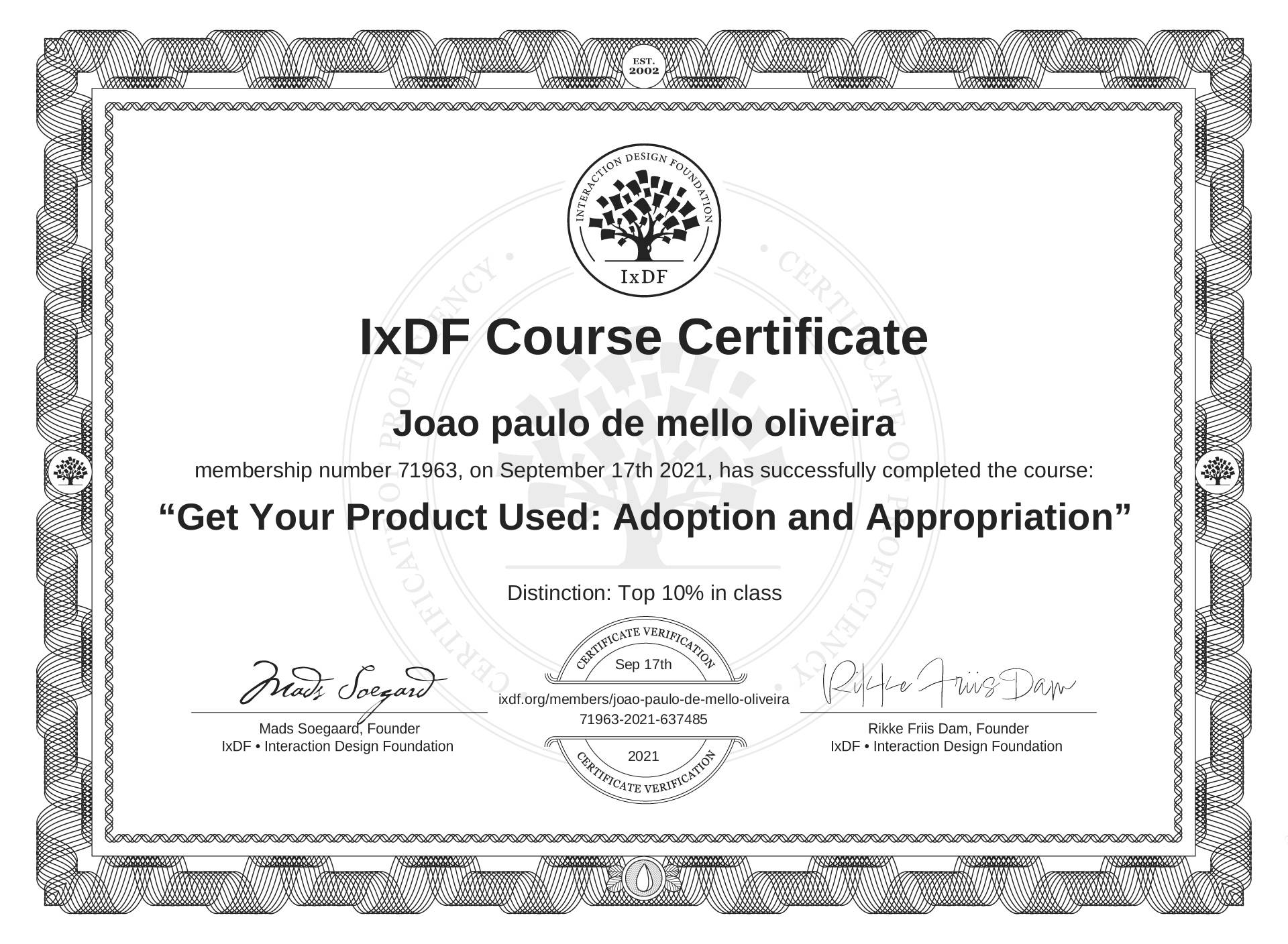 Joao paulo de mello oliveira's IxDF Course Certificate: Get Your Product Used: Adoption and Appropriation