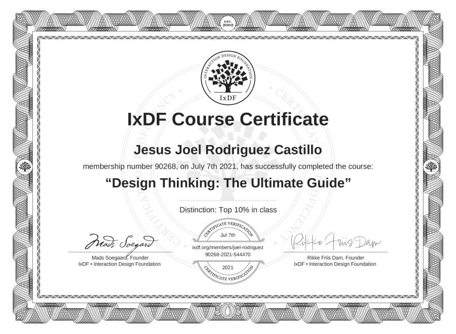 The IxDF Course Certificate above is awarded to Jesús Joel Rodríguez Castillo with a Top 10% Distinction in formal recognition of their coursework surpassing the rigorous benchmarks of exceptional performance established by the IxDF Educational Codex.