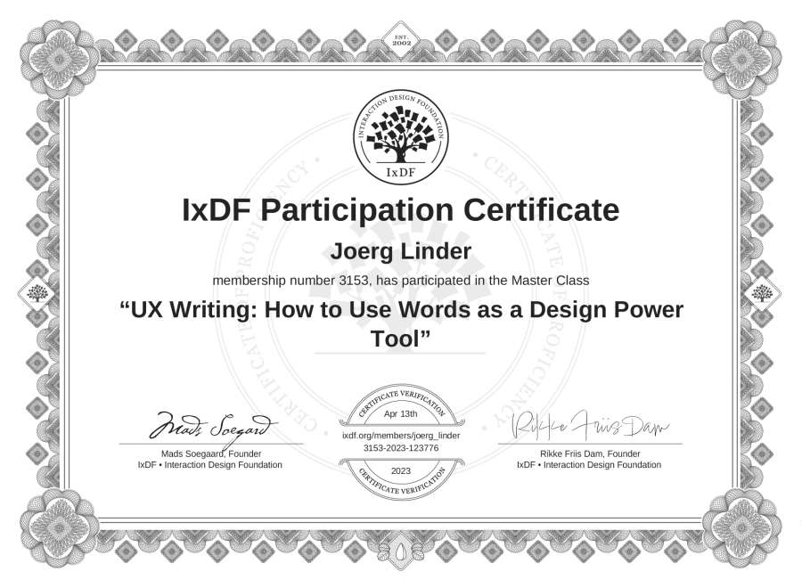 Joerg Linder's IxDF Masterclass Certificate: UX Writing: How to Use Words as a Design Power Tool