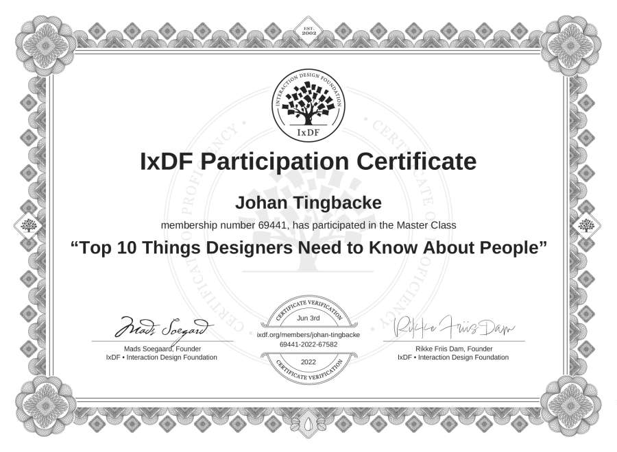 Johan Tingbacke's IxDF Masterclass Certificate: Top 10 Things Designers Need to Know About People