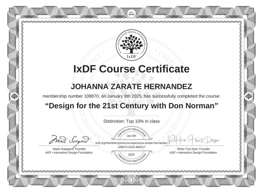 The IxDF Course Certificate above is awarded to JOHANNA ZARATE HERNÁNDEZ with a Top 10% Distinction in formal recognition of their coursework surpassing the rigorous benchmarks of exceptional performance established by the IxDF Educational Codex.