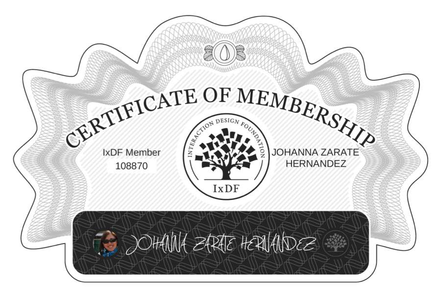 The Membership Certificate below verifies that JOHANNA ZARATE HERNÁNDEZ is a member of Interaction Design Foundation.