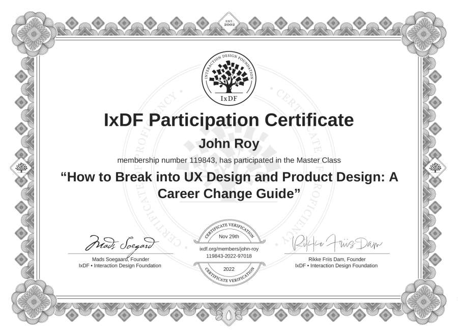 John Roy's IxDF Masterclass Certificate: How to Break into UX Design and Product Design: A Career Change Guide