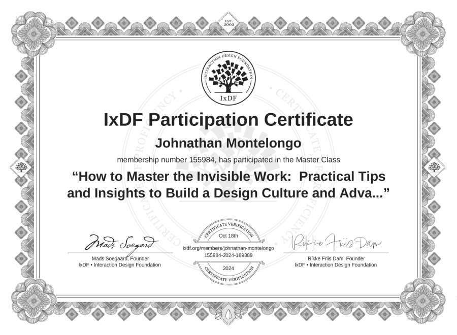 Johnathan Montelongo's IxDF Masterclass Certificate: How to Master the Invisible Work: Practical Tips and Insights to Build a Design Culture and Advance Your Career