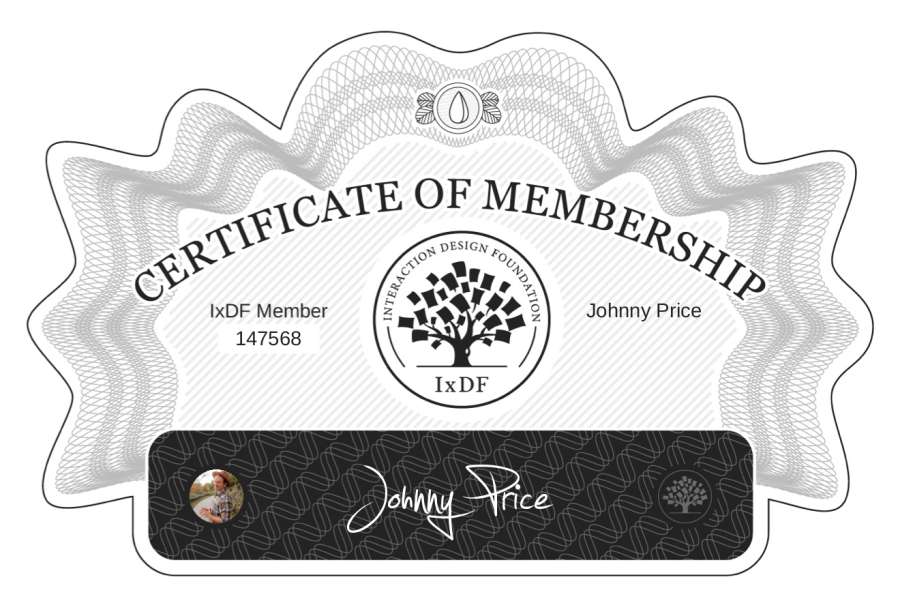 The Membership Certificate below verifies that Johnny Price is a member of Interaction Design Foundation.